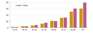- v mladším věku do 34 let bylo evidováno více mužů se zdravotním postižením než žen, celkem 56 %, tento poměr se ale v závislosti s rostoucím věkem obrací